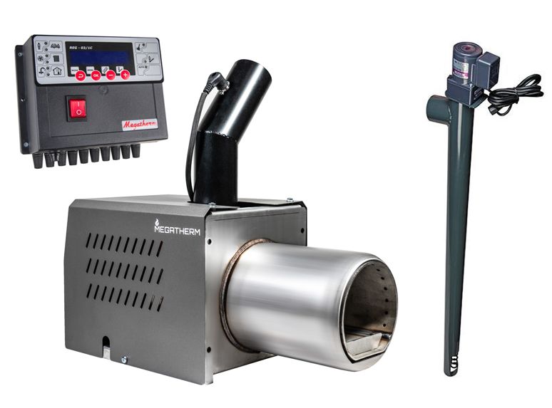 Megatherm Pyro 80 kW, suruõhuga puhastamise valmidus. Komplektis on põleti, kontroller REG-03 ja etteandetigu 1,5 m.